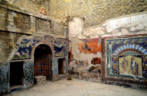 Herculaneum is a very famous archaeological site located about 10 km from Naples on the eastern side of Vesuvius and close to the sea. In 62 AD a strong earthquake destroyed many factories and seventeen years later (79 AD) the terrible eruption of Vesuvius completely buried the city. The excavations offer visitors the beauty of private houses and villas that still retain charred furniture, organic finds and multiple wooden elements belonging to the structural and architectural parts of the buildings.